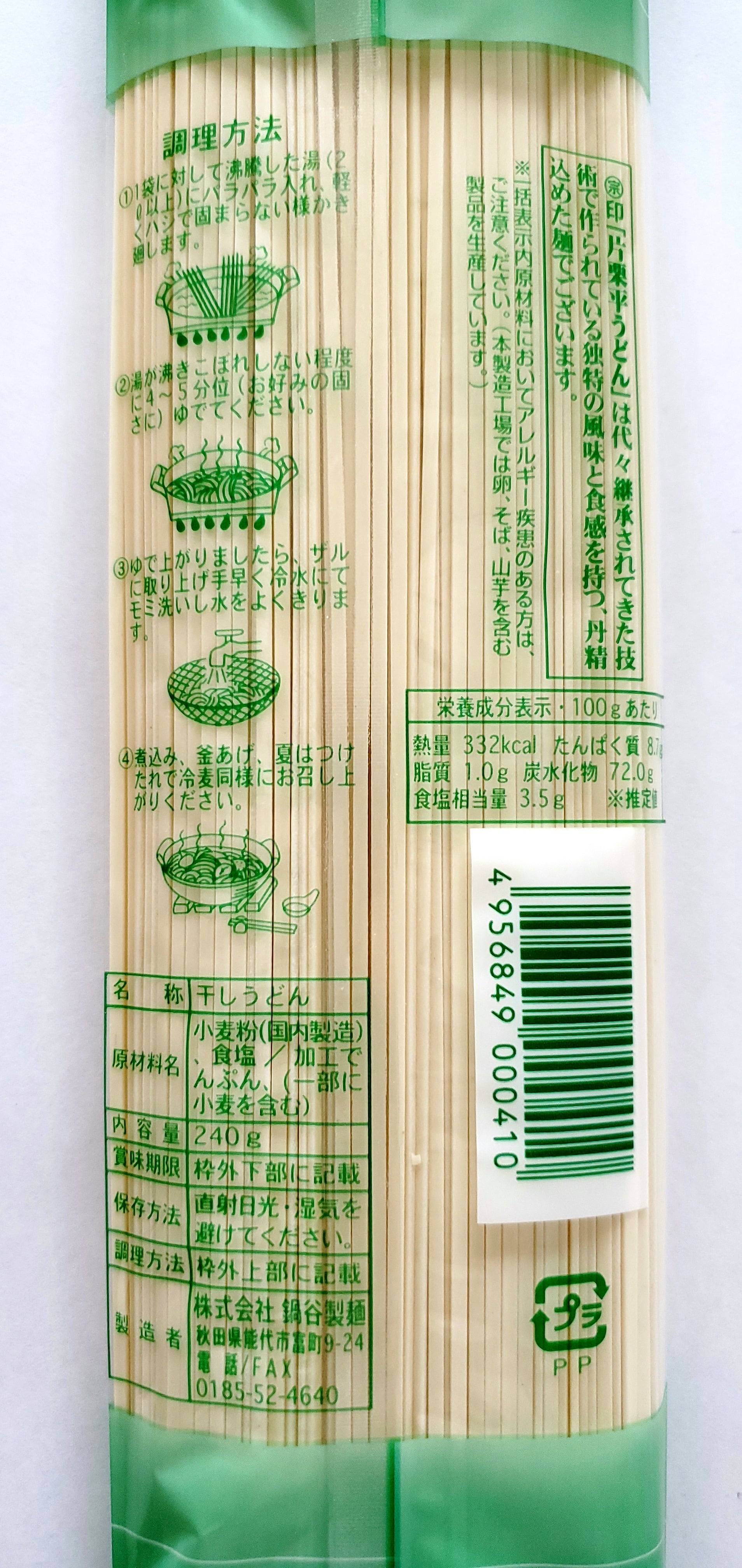 ・賞味期限は片栗うどんが袋枠外下部に印字。平うどんは袋枠外下部のラベルに印字。期限はともに製造から約1年半です。