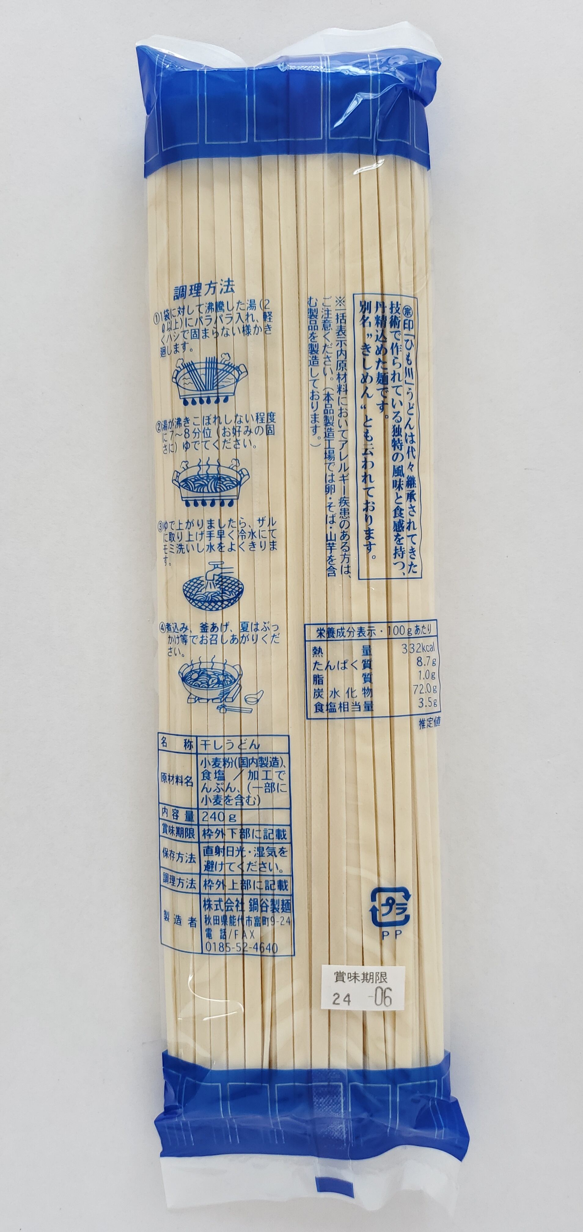 ・賞味期限が片栗うどんは袋枠外下部に印字。期限が製造から約1年半です。ひも川は袋枠外下部のラベルに印字。期限が製造から約1年です。