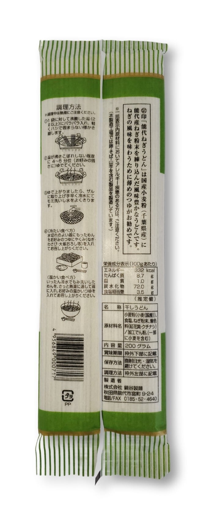 原材料:小麦粉(小麦(国産))、食塩、ねぎ粉末(国産)、着色料(紅花黄・クチナシ)/加工でん粉、(一部に小麦を含む)